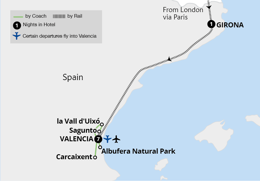 Please note: if travelling by air, your holiday starts today at London Heathrow where you meet the Tour Manager and group before flying to Valencia. In Valencia, we transfer directly to our hotel.